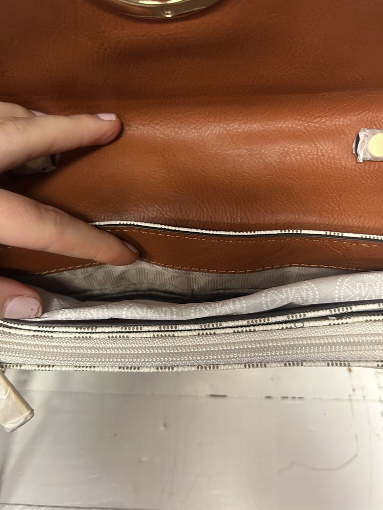 Please see imperfections - Wear to leather throughout, bottom wear, strap wear, cracking leather, corner wear, trim wear, hardware tarnishing, missing front small hardware piece (missing piece included in bag).