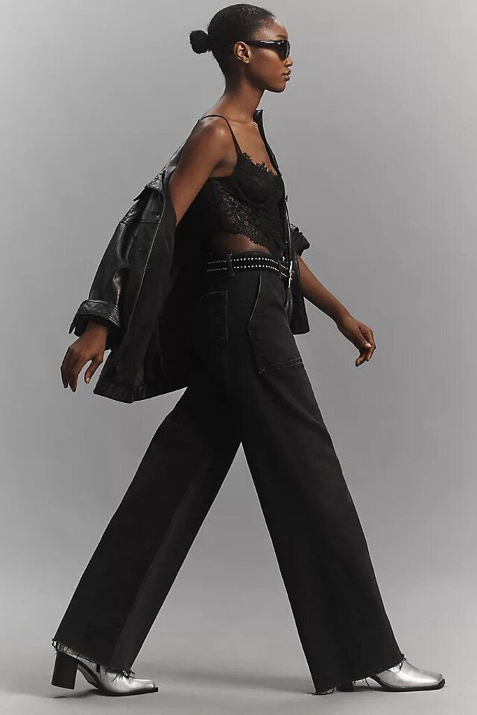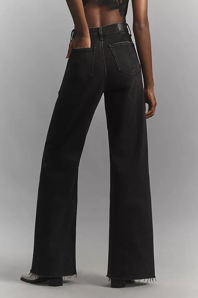 - The Pistola Penny jeans feature a high rise, wide-leg silhouette, and front utility pockets.