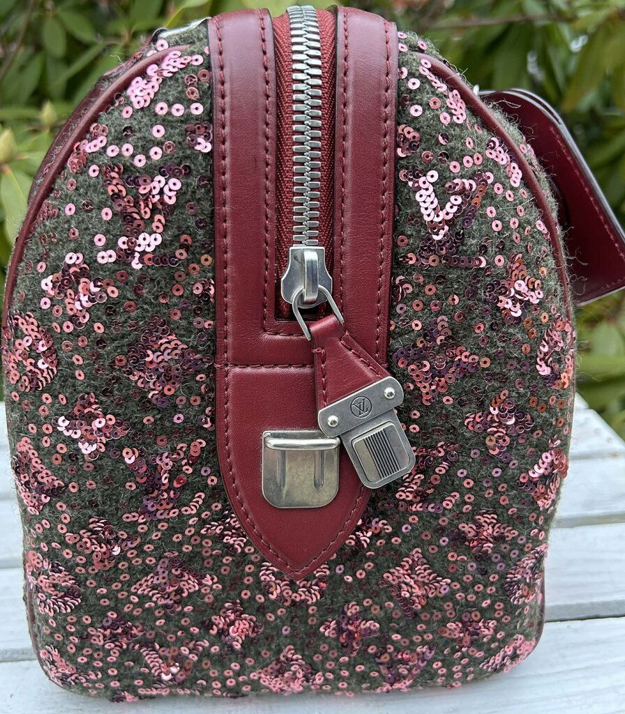 • Please photos for minor imperfections: Wear to feet at base, wear to leather trim, slight marks on exterior, minor tarnishing on hardware, and blemish to exterior, etc.