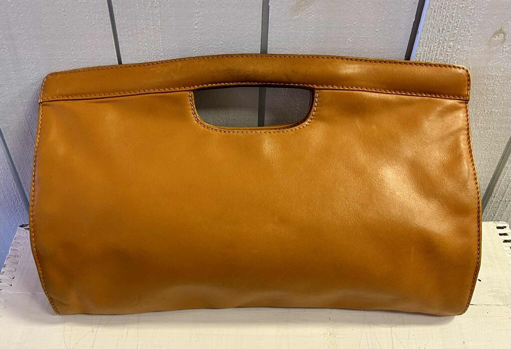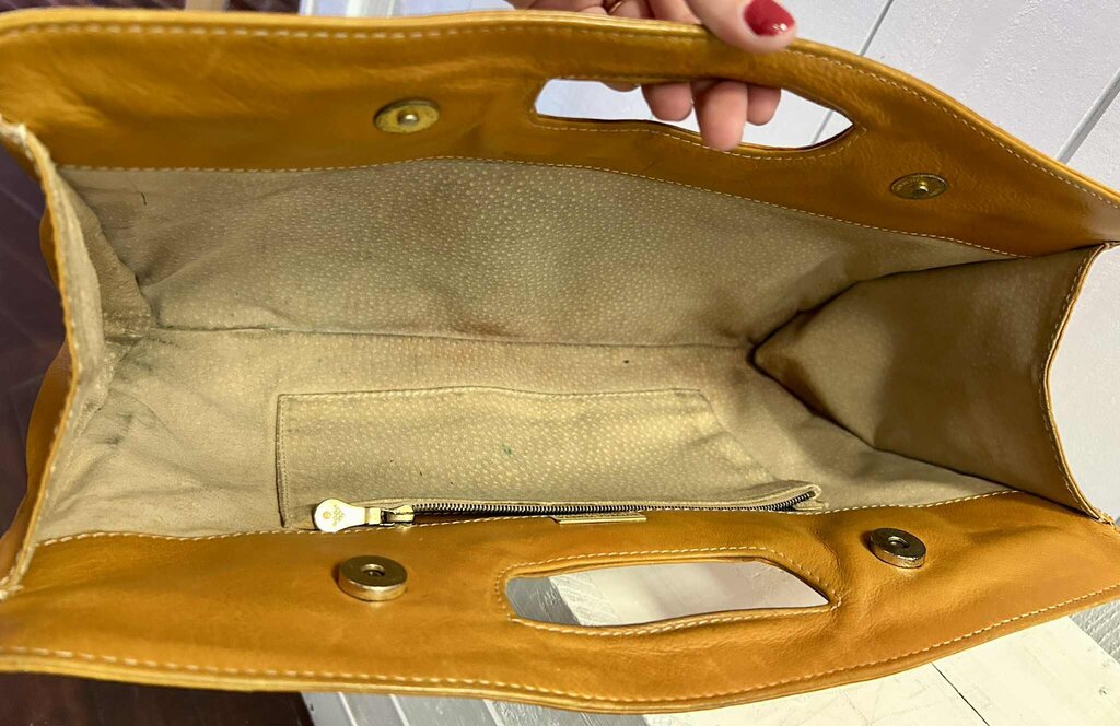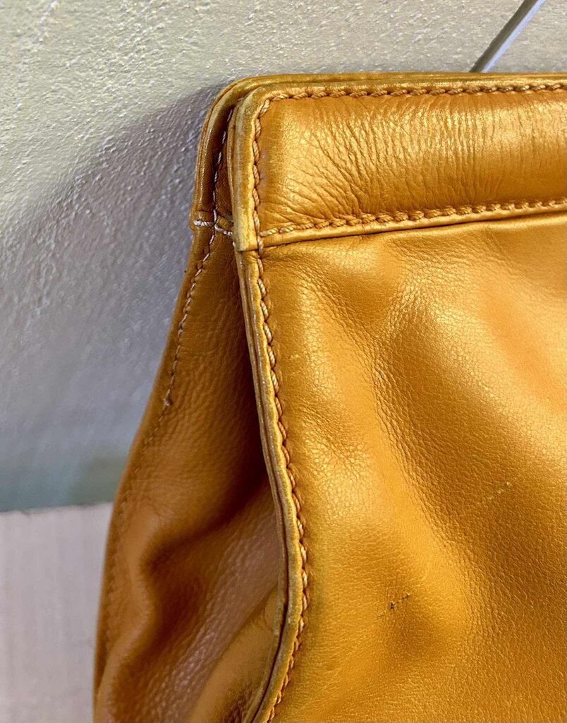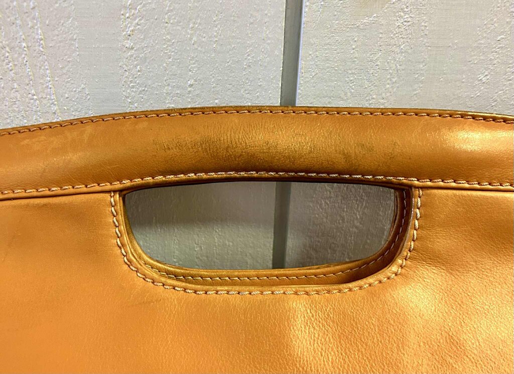 Please see photos for imperfections: minor wear to exterior, slight creasing to vegan leather, slight piling to strap, small pull to exterior thread, minor stains to interior, tarnishing to hardware, etc.