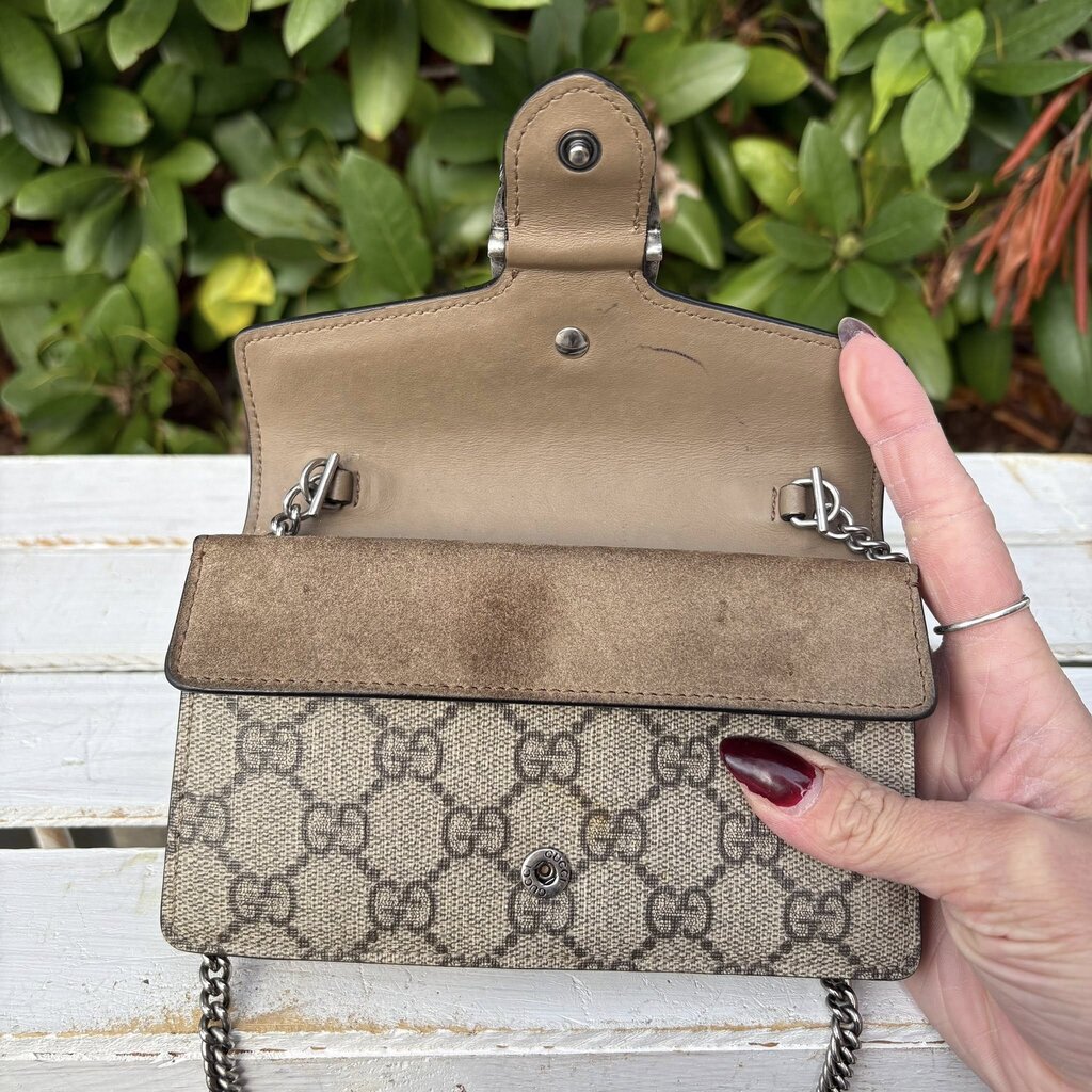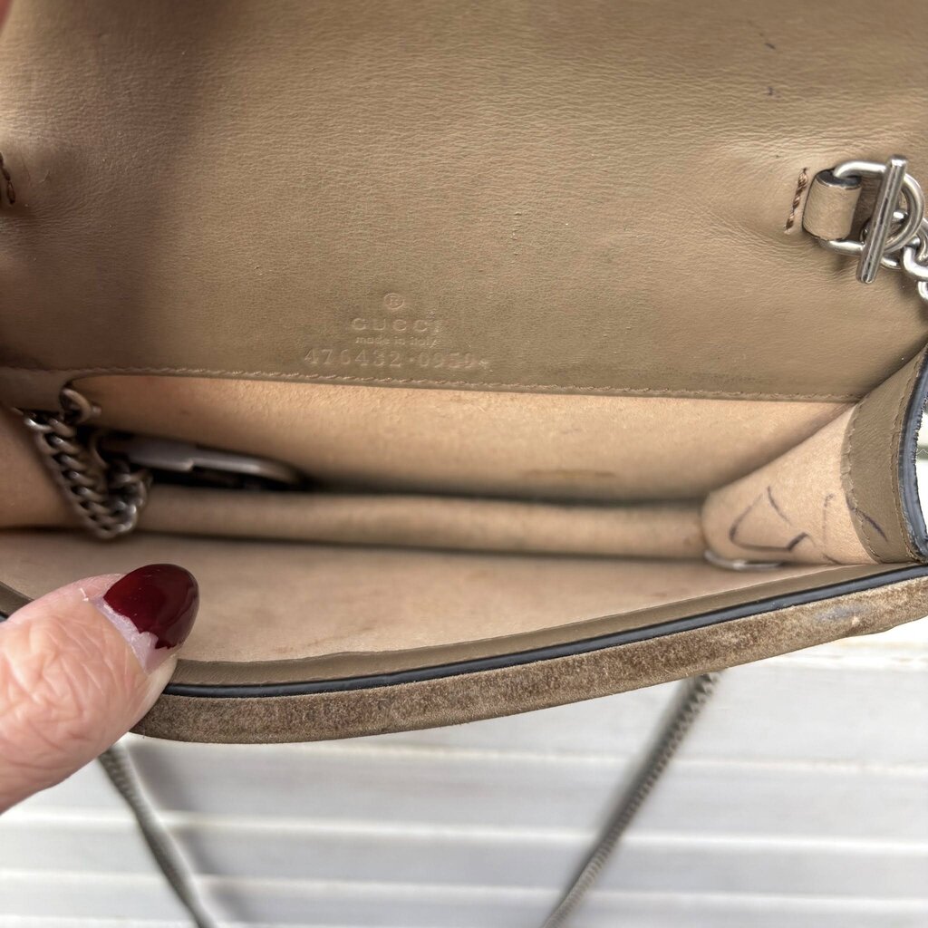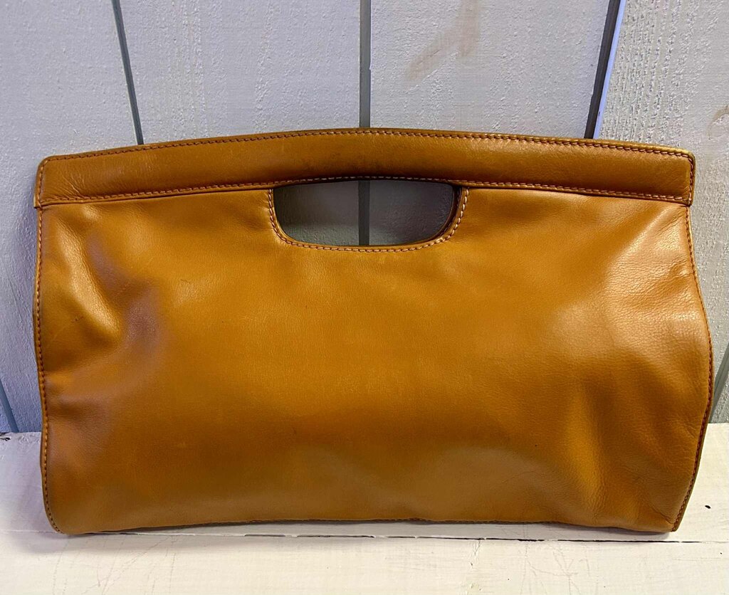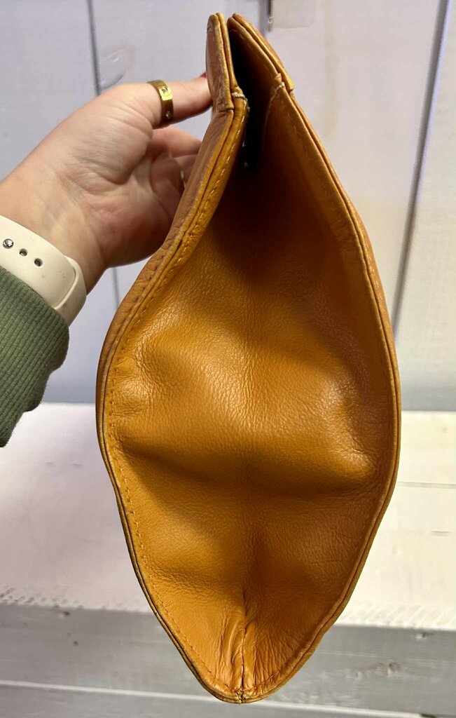 Please see photos for imperfections: minor wear to exterior, slight creasing to vegan leather, slight piling to strap, small pull to exterior thread, minor stains to interior, tarnishing to hardware, etc.