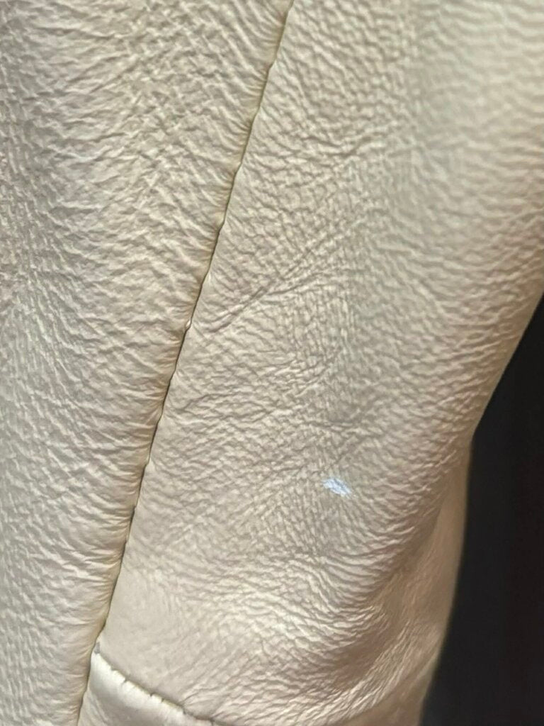 • Please see photos for imperfections: blemish at belt and blemish at arm.